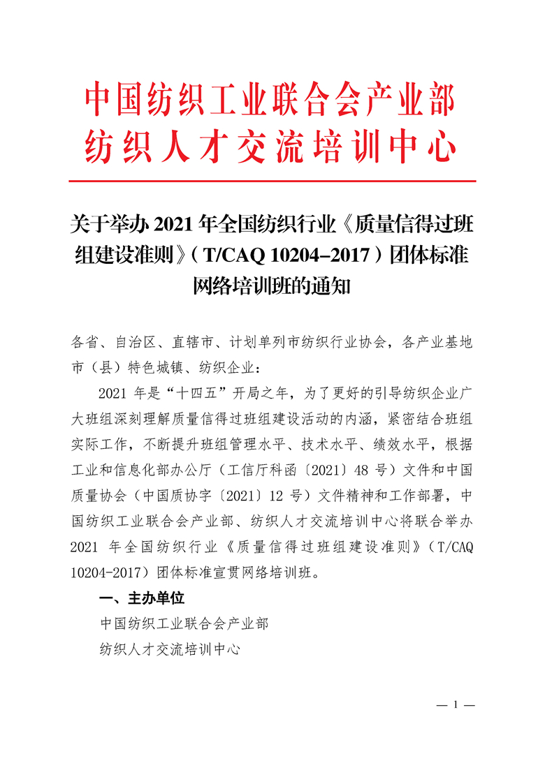 关于举办2021年全国纺织行业《质量信得过班组建设准则》(T/CAQ 10204-2017)团体标准网络培训班的通知